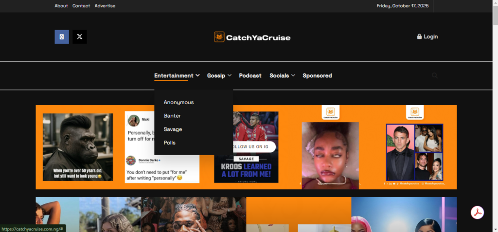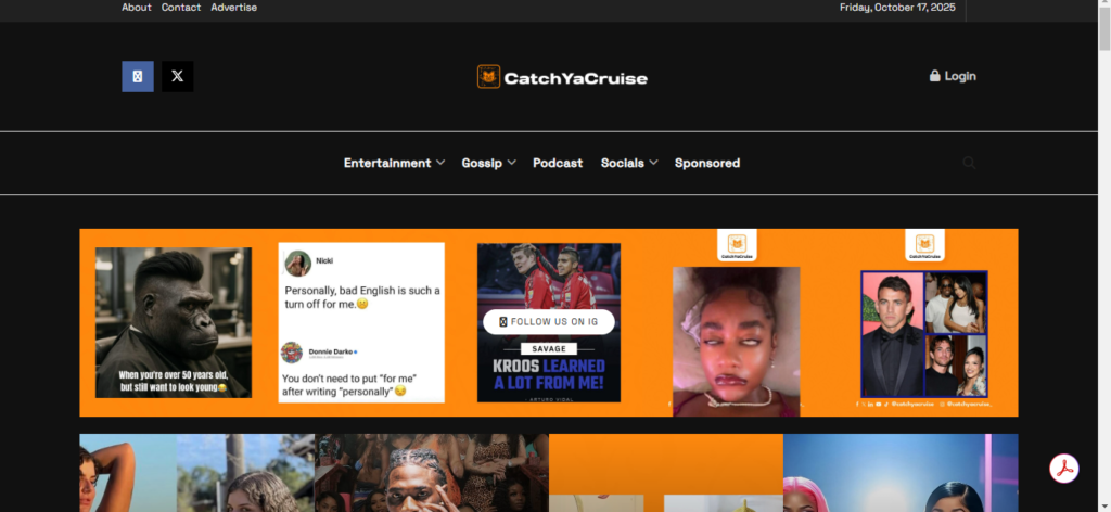 CatchYaCruise is an engaging entertainment and lifestyle blog developed by StayMedia. The platform delivers a wide range of fun and interactive content — from trending stories and savage replies to polls, quizzes, and pop-culture banter. It was built to create a vibrant digital space where readers can relax, laugh, and stay connected to everyday conversations.